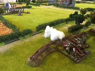 Not ideal as it turned out as this allowed the Ohians behind the wall and the group of Maine troops by the crossroads to unleash crashing volleys which stopped the Georgians in their tracks killing 4 men and inflicting 7 shock. Wisely their Colonel withdrew them to the cover of the woods to regroup.