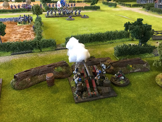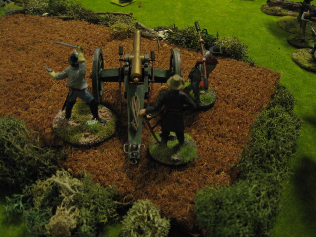 By now the Union artillery had unlimbered, loaded and and drew a bead on the still deploying Confedearate artillery. Their first round was bang on and two Reb gunners were cut down.