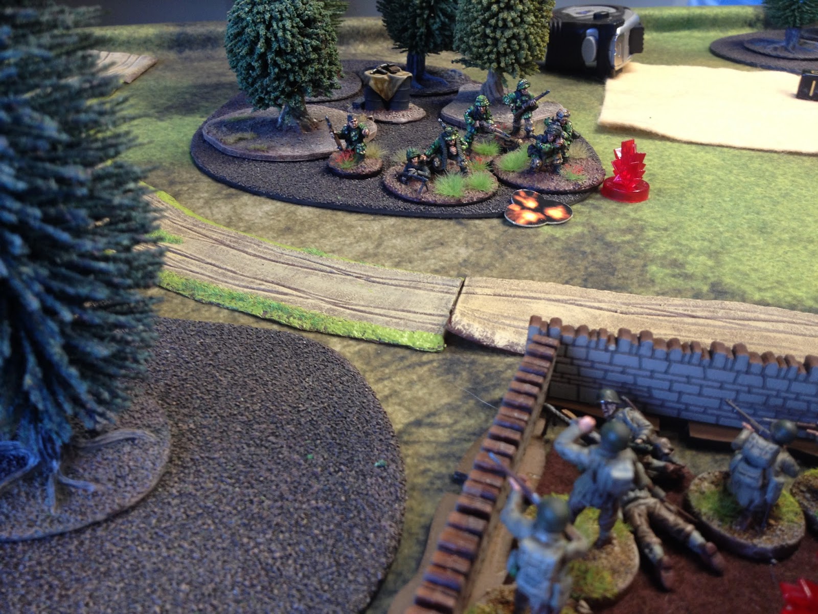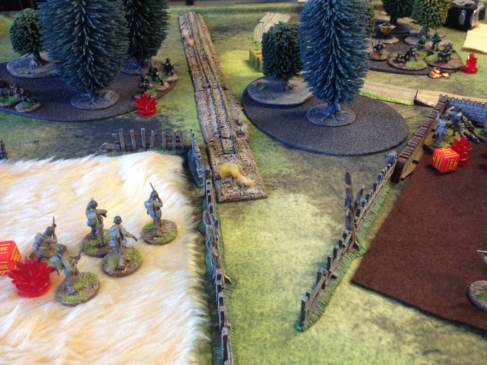 I tried to make the terrain as even as possible with equal amounts of broken ground, forest, swamp, walls and fences etc. Note the home made garden twig trees bordering the swamp to the East. Cheap and cheerful and made in less than two hours.