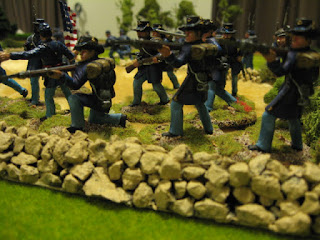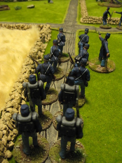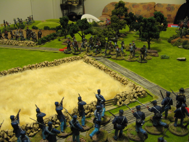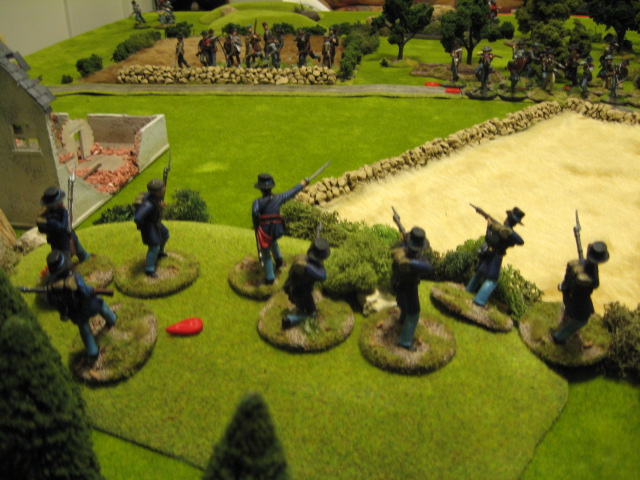Both sides seemed content at this point to settle down to trading volleys but the Union had a decided advantage thanks to having the bulk of their troops formed up behind stone walls and a good run of command cards which allowed them to rally off shock points and maximise their firing. The Wisconsins in particular did deadly work ably assisted by their colloured comrades.